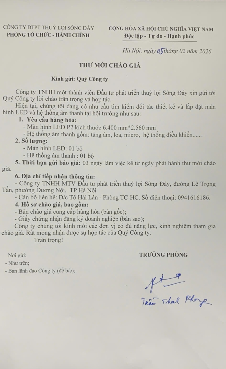 Ngày 20/9/2016 của Công ty ĐTPT thuỷ lợi Sông Đáy có công văn số 337/CTSĐ-QLN về việc tổ chức kiểm tra, báo cáo kết quả kiểm tra công trình sau úng năm 2016 và xây dựng phương án phòng, chống hạn vụ Đông Xuân 2016-2017;
